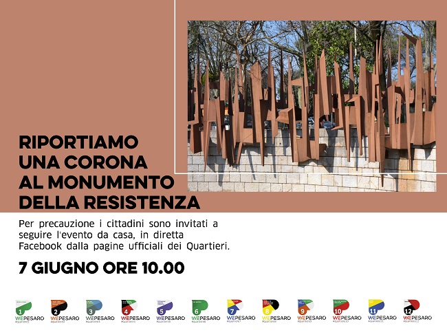PESARO – Dopo l’atto vandalico dello scorso 2 giugno,oggi, domenica 7 alle ore 10, sarà deposta una nuova corona in memoria dei caduti al monumento della Resistenza. L’iniziativa è stata voluta dai presidenti di quartiere: “Nel giorno della Festa della Repubblica, purtroppo, qualcuno ha offeso la memoria di tutti distruggendo la corona posta al Monumento della Resistenza in occasione del 25 Aprile scorso. Come Presidenti dei Quartieri della città – spiega Luca Storoni – , che ogni giorno vivono tra i pesaresi e prestano volontariamente parte del loro tempo alla propria realtà locale, ci ha ferito vedere che in un momento difficile e doloroso come quello che stiamo affrontando a causa del Covid-19, ci sia chi all’unità e alla voglia di ricostruire insieme, contrappone la stupidità e l’ignoranza distruggendo e umiliando i simboli di una comunità, di una città, di una nazione, il ricordo e lo spirito di generazioni che hanno sofferto e sono morte per costruire quello che oggi siamo, una libera Repubblica Democratica”.