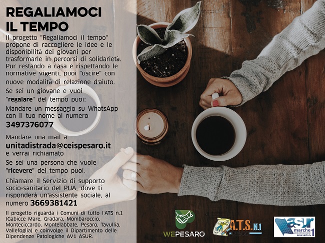 PESARO – Si chiama “Regaliamoci il tempo”, il progetto che propone di raccogliere le idee e le disponibilità dei giovani, per trasformarle in percorsi di solidarietà. Restando a casa e nel rispetto delle regole, sarà possibile sostenere a distanza le persone del nostro territorio che stanno subendo più di altri l’emergenza sanitaria e sociale a causa del COVID-19.