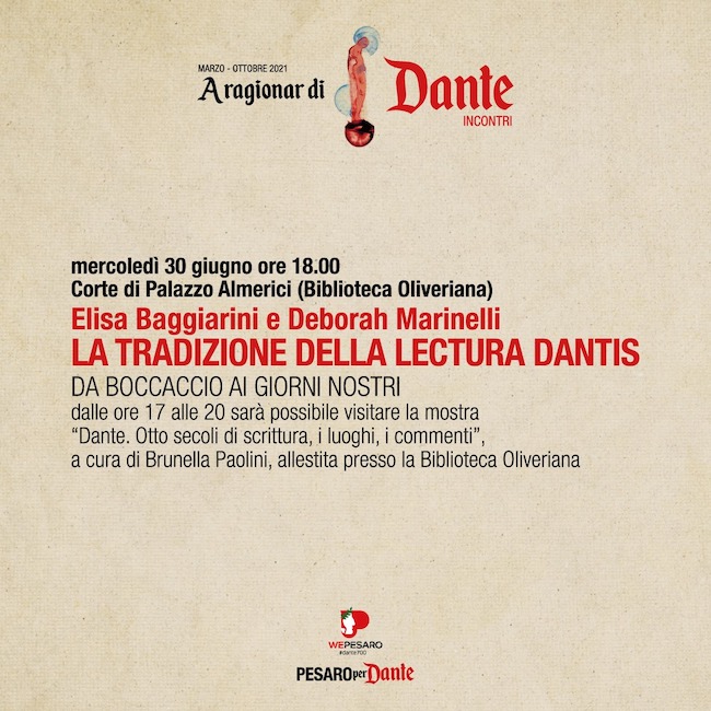 PESARO – Mercoledì 30 giugno 2021, alle ore 18.00, torna la rassegna A ragionar di Dante promossa da Comune di Pesaro, Assemblea Legislativa delle Marche e Università dell’Età Libera sotto l’egida di Pesaro Città che legge, è con Elisa Baggiarini e Deborah Marinelli. Titolo del sesto appuntamento è ‘La tradizione della lectura Dantis da Boccaccio ai giorni nostri’. Realizzato in collaborazione con Ente Olivieri – Biblioteca e Musei Oliveriani, l’appuntamento si svolge nella corte di Palazzo Almerici, sede appunto di Biblioteca e Museo Archeologico Oliveriano.