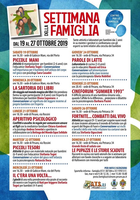 PESARO – Il Centro per le Famiglie dell’ATS n.1 di Pesaro e Gabicce Mare propone la 2° edizione della Settimana della Famiglia, dal 19 al 27 ottobre. Sarà un momento dedicato alla famiglia, risorsa fondamentale per lo sviluppo della comunità, che ha come obiettivo quello di perseguire il benessere e la salute per ogni membro del nucleo familiare, fondamentale per fare crescere la comunità al meglio.
