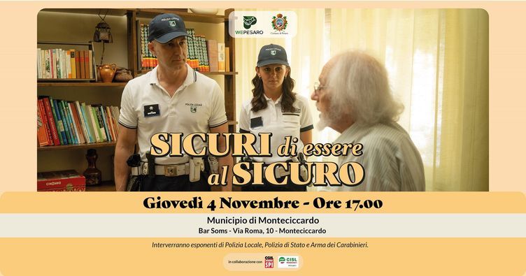 PESARO – È in programma giovedì 4 novembre, alle 17, al bar Soms di via Roma 10, Municipio di Monteciccardo, “Sicuri di essere al sicuro” la campagna promossa dal Comune di Pesaro in collaborazione con Cigl e Cisl per contrastare e prevenire le truffe agli anziani.