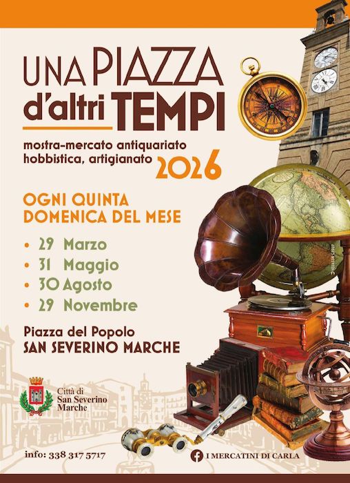 SAN SEVERINO MARCHE – La splendida cornice di piazza del Popolo a San Severino Marche si prepara a trasformarsi nuovamente in un salotto a cielo aperto dedicato al fascino del passato. Torna infatti l’appuntamento con “Una Piazza d’altri Tempi”, la mostra-mercato dedicata all’antiquariato, all’hobbistica e all’artigianato artistico.