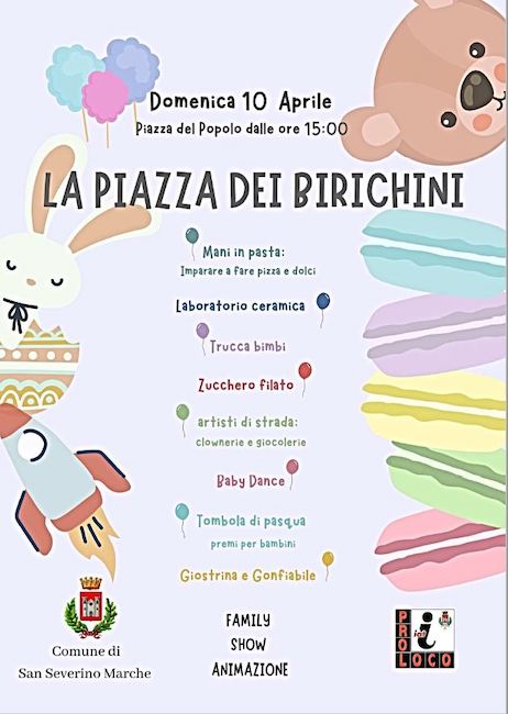 Domenica 10 aprile arriva “La Piazza dei Birichini”. Nella splendida piazza Del Popolo, il Comune di San Severino Marche e la Pro Loco, che ha messo a disposizione anche i premi della tombola, daranno vita a una festa per i più piccoli e le loro famiglie ma aperta a tutti. Come cornice dell’evento sarà ospitato anche un mercatino dedicato ai prodotti per bambini. L’ingresso sarà libero.