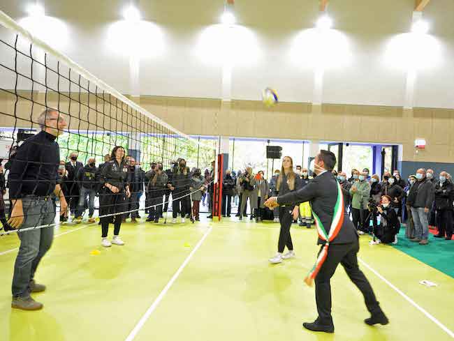 Zorzi ha inaugurato la nuova struttura palleggiando con le ragazze della squadra di A2, CBF Balducci di Macerata e i ragazzi delle scuole medie di Pieve Torina e di Visso. Altri giovani hanno giocato a basket e si sono arrampicati alla parete.