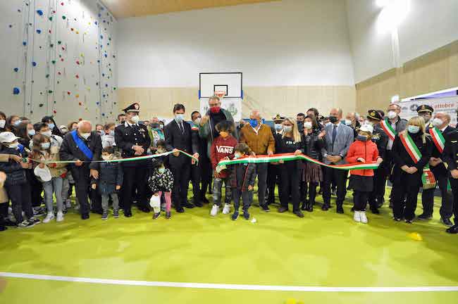 Il Sindaco di Pieve Torina, Alessandro Gentilucci con la Presidente della Fondazione, Mariavittoria Rava, i donatori e gli studenti hanno tagliato il nastro insieme a Fabrizio Curcio, Capo Dipartimento Protezione Civile, Francesco Acquaroli, Presidente della Regione Marche e tanti sindaci del territorio e Andrea Zorzi ex pallavolista e 2 volte Campione del mondo con la “Generazione di Fenomeni”. L’inaugurazione si è conclusa con l’esecuzione dell’Inno Nazionale.