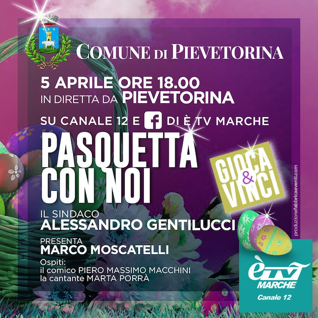 “Due artisti importanti che porteranno un sorriso e un po’ di spensieratezza in questi giorni difficili” sottolinea il sindaco, Alessandro Gentilucci. La formula è quella di una diretta televisiva affidata alla sapiente regia di Marco Moscatelli in cui vi sarà la possibilità, per i telespettatori, di telefonare in diretta e partecipare ad un gioco in cui verranno assegnati dei premi “pasquali”. Spazio anche a saluti da casa e approfondimenti su temi specifici ma, soprattutto, spazio al divertimento “perché è un giorno di festa, e vogliamo che sia vissuta con gioia e simpatia in ogni famiglia, di Pieve Torina e non” conclude Gentilucci che sarà anche lui in prima fila in rappresentanza dell’intera comunità. La diretta sarà trasmessa lunedì 5 aprile a partire dalle ore 18 sul canale 12 e sulla pagina facebook di ÈTV.