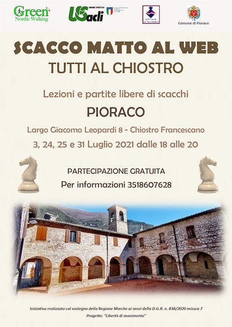 Lo splendido chiostro francescano in Largo Leopardi 8 a Pioraco ospiterà nei giorni 3, 24, 25 e 31 luglio, dalle ore 18 alle ore 20, lezioni e partite libere di scacchi con gli istruttori Marco Pelagalli e Dante Guglielmi.