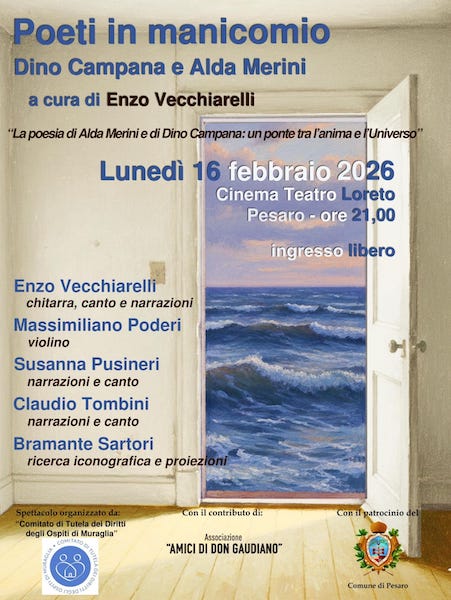 PESARO – Oggi, lunedì 16 febbraio 2026, alle ore 21.00, al Cinema Teatro Loreto di Pesaro andrà in scena lo spettacolo gratuito “Poeti in manicomio: Dino Campana e Alda Merini”, con il patrocinio del Comune di Pesaro e il sostegno dell’Associazione Amici di Don Gaudiano di Pesaro.