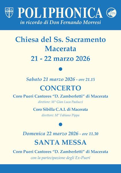 MACERATA – Torna anche quest’anno “Poliphonica”, l’appuntamento musicale organizzato dai Pueri Cantores “Domenichino Zamberletti” di Macerata per ricordare Don Fernando Morresi, indimenticato Maestro per tante generazioni di maceratesi e fondatore del Coro,