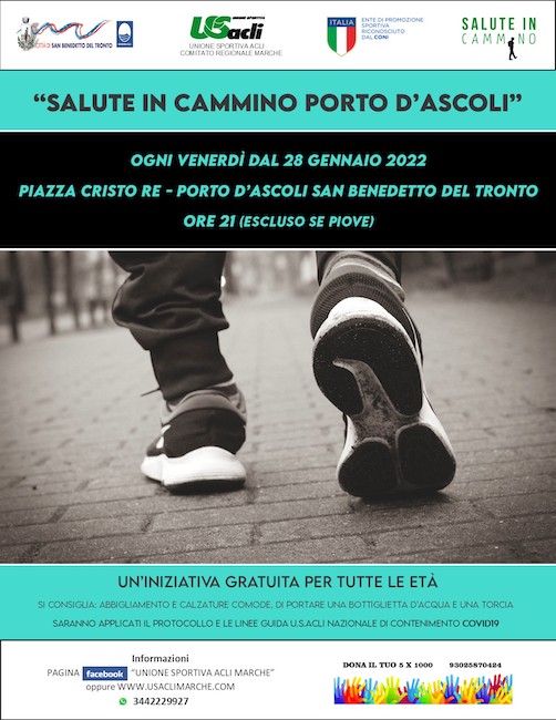 SAN BENEDETTO DEL TRONTO – Dopo la pausa natalizia, di fine 2021 e di inizio 2022, venerdì 28 gennaio riprenderà l’iniziativa “Salute in cammino” che va avanti ormai da più di 8 anni visto che è stato avviato nell’estate del 2013.