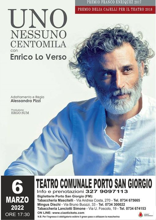 PORTO SAN GIORGIO (FM) – Domenica 6 Marzo 2022, al Teatro Comunale di Porto San Giorgio, alle ore 17.30 andrà in scena “Uno Nessuno Centomila” con Enrico Lo Verso.Lo spettacolo è una produzione di Ergo Sum, con l’adattamento e la regia di Alessandra Pizzi ed è organizzato con il patrocinio del Comune di Porto San Giorgio. Nuova tappa marchigiana per l’attore siciliano, che si era già esibito sul palcoscenico di Rocca Tiepolo nell’estate 2019, registrando il sold out.