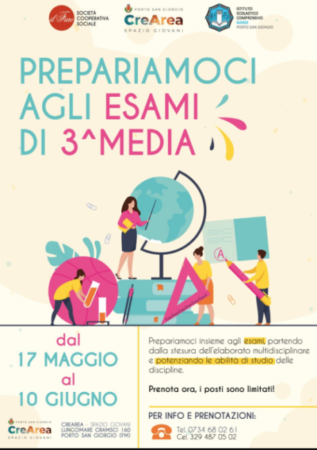 Lunedì 17 maggio 2021 al Centro giovanile di lungomare Gramsci n. 160 partirà un laboratorio di supporto agli studenti per la preparazione agli esami di terza media, in collaborazione con gli insegnanti e la dirigente dell’Isc Nardi Daniela Medori. Il messaggio, nella coloratissima locandina, recita: “Prepariamoci insieme agli esami” . L’iniziativa si chiuderà il 10 giugno.