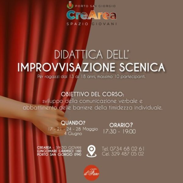 Sempre il 17 maggio al Centro giovanile inizieranno cinque lezioni sulla didattica dell’improvvisazione scenica, con l’obiettivo di sviluppare la comunicazione verbale e abbattere le barriere della timidezza individuale. Il laboratorio è rivolto a ragazzi dai 13 ai 18 anni per un massimo di 10 partecipanti.