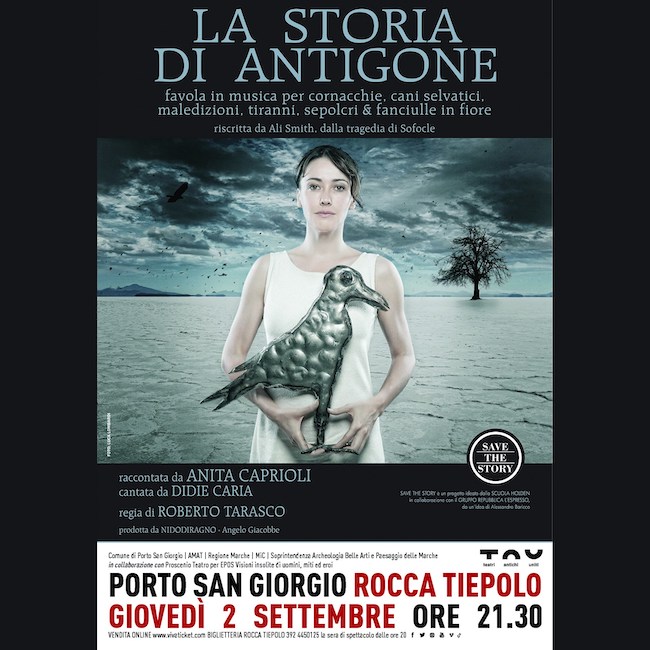 PORTO SAN GIORGIO (FM) – Giovedì ,2 settembre 2021, alle ore 21.30, a Rocca Tiepolo di Porto San Giorgio, andrà in scena “La storia di Antigone”.Favola in musica per cornacchie, cani selvatici, maledizioni, tiranni, sepolcri & fanciulle in fiore, riscritta da Ali Smith, dalla tragedia di Sofocle.Raccontata da Anita Caprioli, cantata da Didie Caria.