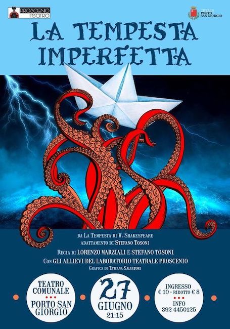 PORTO SAN GIORGIO (FM) – Lunedì, 27 giugno 2022, alle ore 21.15, al Teatro Comunale di Porto San Giorgio gli allievi della master class di Proscenio Teatro, seguiti e diretti da Lorenzo Marziali e Stefano Tosoni porteranno in scena “La tempesta imperfetta”. Adattamento del testo a cura di Stefano Tosoni.
