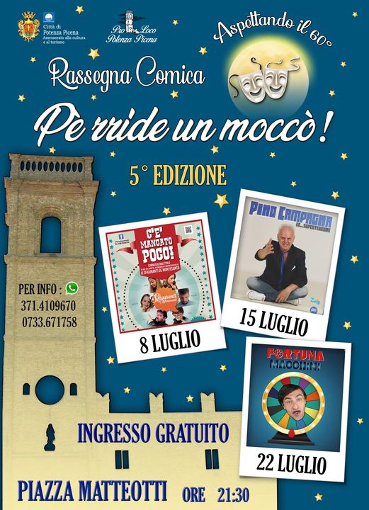 POTENZA PICENA (MC) – La stagione estiva invita a uscire e trascorrere delle serate in allegria. Allora non c’è nulla di meglio delle proposte della 5° edizione della Rassegna Comica “Pè rride un moccò!” che si terrà a Potenza Picena. Tre gli appuntamenti, con ingresso gratuito, previsti in Piazza Matteotti alle ore 21.30: