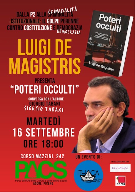 ASCOLI PICENO – Martedì 16 settembre 2025, alle ore 18.00, presso il bellissimo PACS di Ascoli Piceno (corso Mazzini, 242), si terrà la presentazione del libro di Luigi De Magistris “Poteri occulti. Dalla P2 alla criminalità istituzionale: il golpe perenne contro Costituzione e democrazia” (Fazi). A moderare l’incontro, Giorgio Tabani.