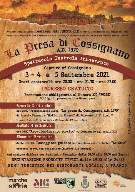 COSSIGNANO (AP) – Dal 3 al 5 settembre 2021 il centro storico di Cossignano diventerà palcoscenico naturale per la rappresentazione di uno spettacolo teatrale itinerante nel quale la tradizione si contamina con elementi contemporanei: l’ evento che ha ottenuto l’approvazione e il finanziamento della Regione Marche è denominato “La presa di Cossignano A.D. 1370 – Capture of Cossignano”. Si inserisce nell’ambito del Festival MArCHESTORIE Racconti & Tradizioni dai borghi in festa – Progetto di Regione Marche / Assessorato alla Cultura, in collaborazione con AMAT e Fondazione Marche Cultura, con il quale si vogliono raccontare le Marche attraverso i suoi borghi, i suoi sapori, la sua vicenda millenaria ma soprattutto le sue storie.