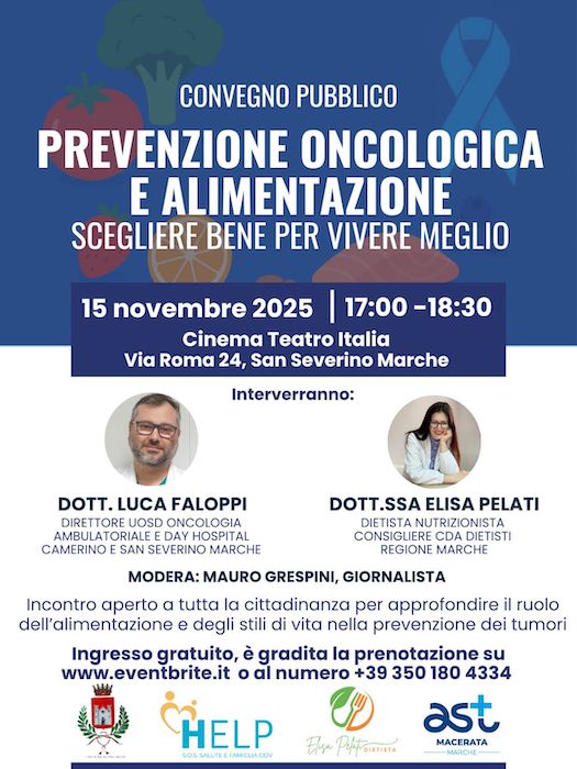 Il convegno è promosso dall’Associazione HELP SOS Salute e Famiglia ODV, con il patrocinio del Comune di San Severino Marche e dell’AST di Macerata. Interverranno il Dott. Luca Faloppi, direttore UOSD Oncologia Ambulatoriale e Day Hospital di Camerino e San Severino Marche e la Dott.ssa Elisa Pelati, Dietista Nutrizionista e consigliere CDA dei dietisti della Regione Marche, per approfondire le strategie di prevenzione primaria, il ruolo dell’alimentazione e l’importanza degli stili di vita. Modera Mauro Grespini, giornalista.