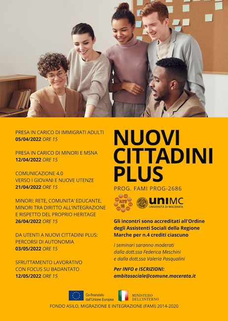 MACERATA – Prenderanno il via ad aprile i seminari tematici del progetto FAMI “Nuovi Cittadini Plus” – PROG-2686, iniziativa che vede l’Ambito Territoriale Sociale 15 e l’Università di Macerata impegnate, rispettivamente nei ruoli di capofila e partner, nella promozione di attività di capacity building a tema migratorio destinate a operatori pubblici e privati, impegnati a pianificare ed erogare servizi e interventi sul territorio.