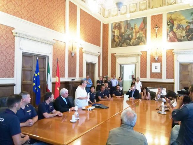 Ieri i sei agenti, accompagnati dal questore Oreste Capocasa, sono stati ricevuti dal sindaco Valeria Mancinelli che ha ha consegnato loro un certificato di riconoscimento “per aver gestito con professionalità, coraggio, determinazione e alto senso del dovere la drammatica situazione che si è verificata in occasione del nubifragio che il 14 giugno si è abbattuto sulla città di Ancona e che ha reso necessario il salvataggio di due persone intrappolate nella loro auto invasa dall’acqua. Il sindaco Valeria Mancinelli e la Città di Ancona li ringraziano”.