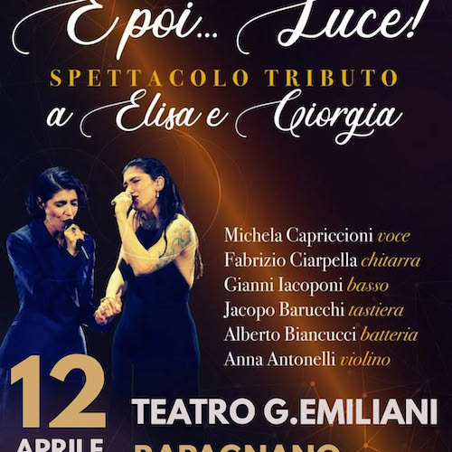RAPAGNANO – Due voci straordinarie, un unico palco e un’emozione che attraversa generazioni: debutta domenica 12 aprile alle ore 21:00, presso il Teatro Emiliani di Rapagnano, “E poi… luce!”, il nuovo spettacolo musicale dedicato a Elisa e Giorgia.