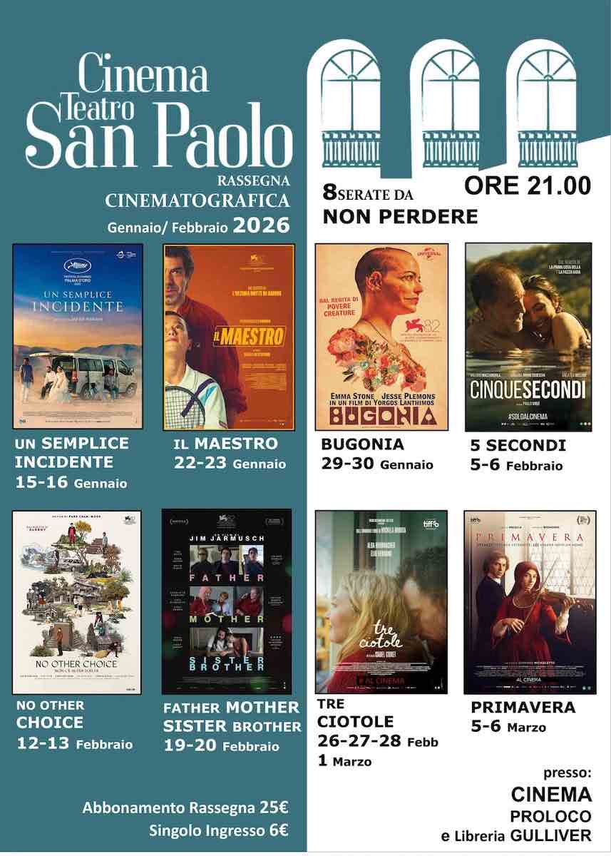 Il percorso proseguirà per tutto il mese di febbraio e l’inizio di marzo con titoli di grande richiamo come “Cinque Secondi” (5-6 febbraio), “No Other Choice” (12-13 febbraio), il nuovo lavoro di Jim Jarmusch “Father Mother Sister Brother” (19-20 febbraio) e “Tre Ciotole”, che godrà di una programmazione speciale dal 26 febbraio al 1 marzo. La rassegna si concluderà il 5 e 6 marzo con la pellicola “Primavera”.