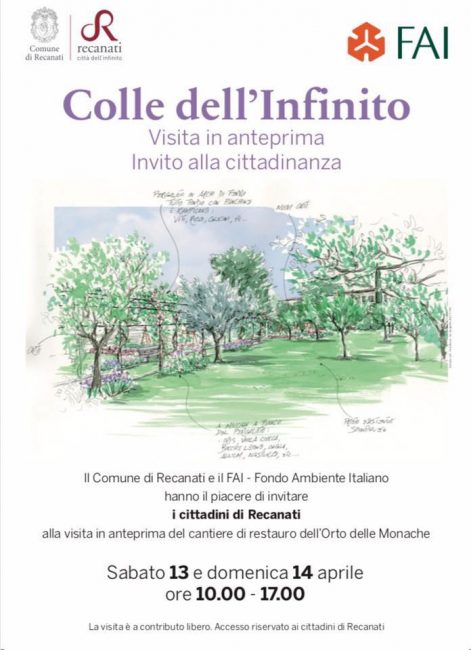 RECANATI – Sabato 13 e domenica 14 aprile 2019 dalle ore 10 alle 17, il FAI – Fondo Ambiente Italiano invita la cittadinanza recanatese a una visita in anteprima del Colle dell’Infinito dopo gli interventi di riqualificazione botanica dell’Orto delle Monache, il luogo dove Leopardi concepì nel 1819 il canto “L’infinito”.