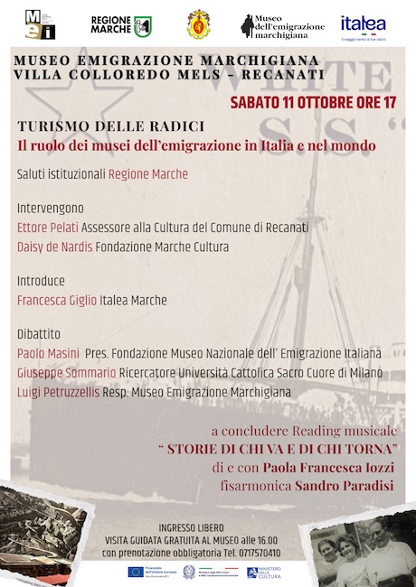 RECANATI – Sabato 11 ottobre, alle ore 17.00 presso il Museo Civico di Villa Colloredo Mels, si parlerà nuovamente dell’attualissimo tema del Turismo delle Radici in un dibattito che vedrà ospiti d’eccezione Paolo Masini, Presidente della Fondazione Museo Nazionale dell’Emigrazione Italiana di Genova, che interverrà in merito alla diffusione della memoria storica e culturale dei fenomeni migratori e i nuovi progetti in essere, e Giuseppe Sommario, ricercatore Università Cattolica Sacro Cuore di Milano, tra i massimi esperti internazionali di fenomeni migratori, il quale illustrerà il ruolo dei musei dell’emigrazione come spazio di Restanza e Resistenza.