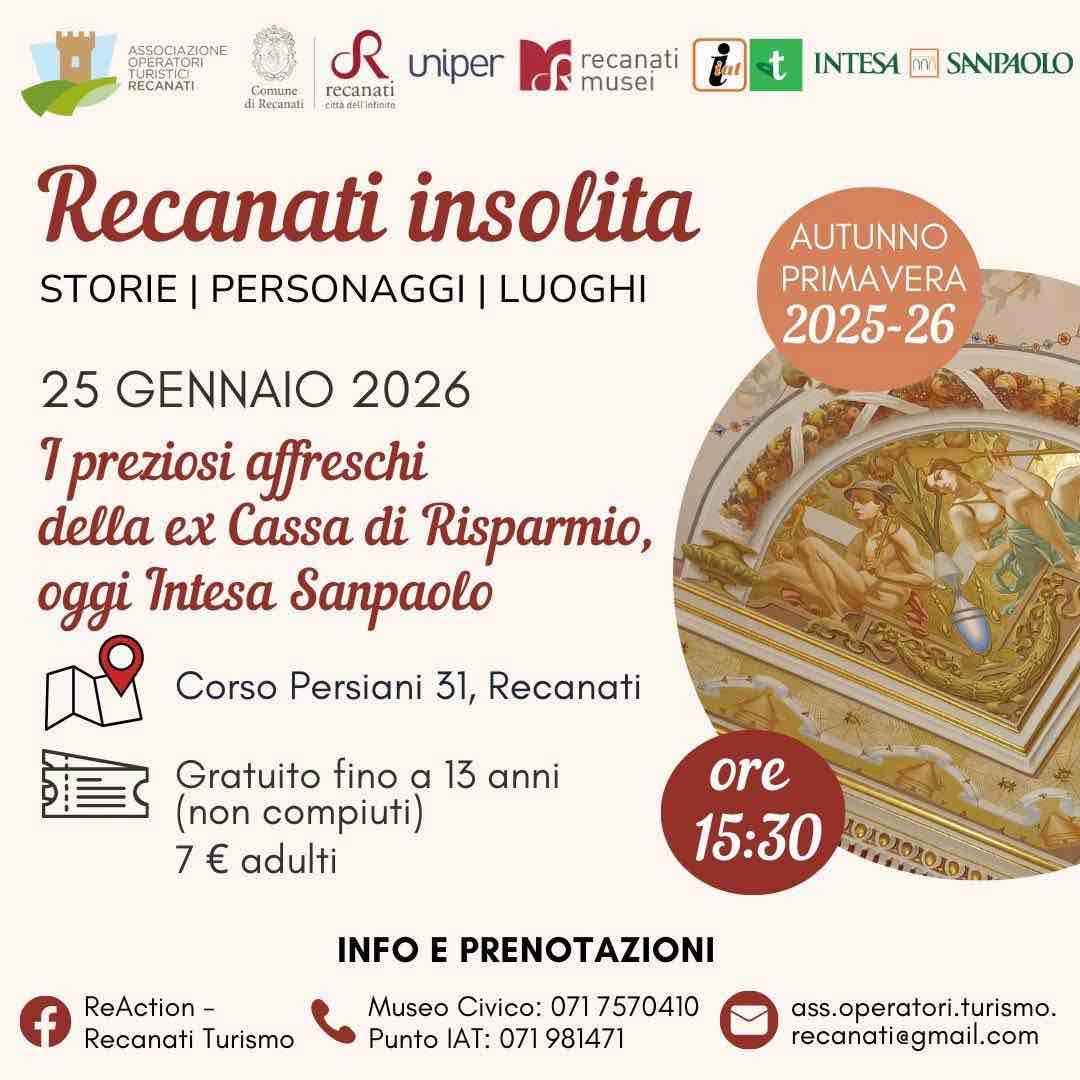 Un tour assolutamente inedito e super esclusivo: le porte del palazzo si aprono appositamente per noi, offrendo l’occasione di ammirare luoghi e scoprire storie di grande fascino. Un appuntamento unico tra arte, filantropia e mistero, per inaugurare insieme il primo tour del 2026 di “Recanati Insolita”, ciclo di visite guidate nato da un’idea dell’Associazione Operatori Turistici e realizzato con la collaborazione dell’Università d’Istruzione Permanente Don Giovanni Simonetti (Uniper), del circuito museale Infinito Recanati e del Comune di Recanati.