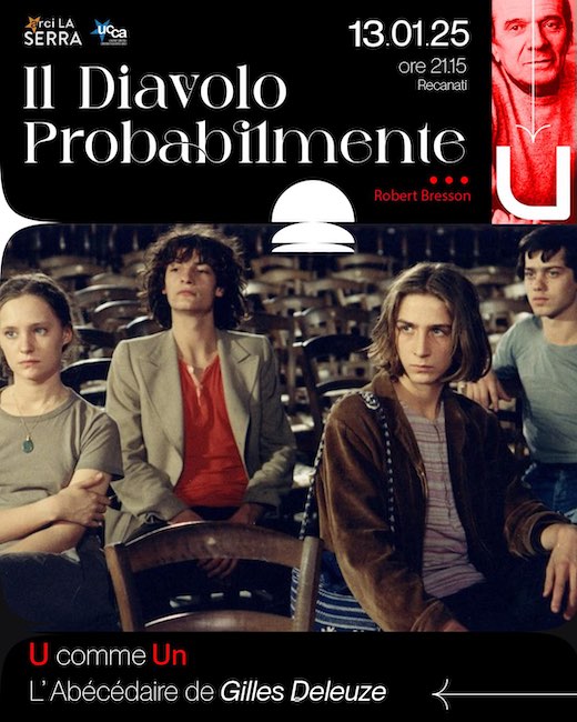 RECANATI – Martedì 13 gennaio, alle ore 21.15, il Circolo Arci La Serra/Ucca di Recanati presenterà la proiezione del film “Il diavolo probabilmente” (1977) di Robert Bresson, preceduto dalla lettera “U comme Un” dalla celebre intervista a Deleuze intitolata “L’Abécédaire de Gilles Deleuze” e andata in onda postuma nel 1995 sul canale Arté.