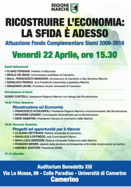 ANCONA – “Ricostruire l’economia: la sfida è adesso – Attuazione Fondo Complementare Sismi 2009-2016”: questo l’argomento dell’incontro organizzato dalla Regione Marche venerdì 22 aprile alle ore 15.30 nell’Auditorium Benedetto XIII a Camerino (Via le Mosse, 99 – Colle Paradiso – Università di Camerino) al quale interverranno il presidente della Regione Marche Francesco Acquaroli e l’assessore alla Ricostruzione Guido Castelli.