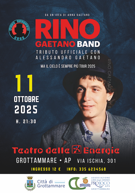 GROTTAMMARE (AP) – Sabato,11 ottobre 2025, al Teatro delle Energie di Grottammare con inizio alle ore 21.15, si terrà il concerto della Rino Gaetano Band a firma Lido degli Aranci. Non una semplice cover band ma un progetto importante iniziato dalla sorella Anna e dal 2013 portato avanti dal nipote Alessandro per ricordare l’amato cantautore calabrese.