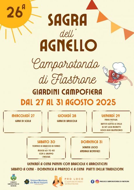 CAMPOROTONDO DI FIASTRONE (MC) – Dal 27 al 31 agosto 2025, presso i giardini pubblici in Via Campo Fiera, a Camporotondo di Fiastrone si terrà la 26ª Sagra dell’Agnello, organizzata dall’Associazione Turistica Pro Loco.