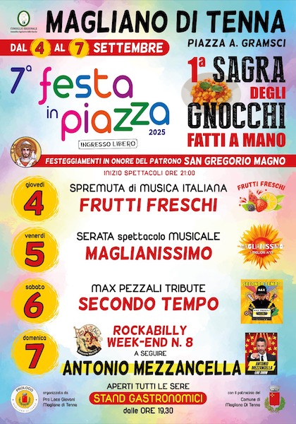 MAGLIANO DI TENNA (FM) – Dal 4 al 7 settembre 2025, nell’ambito dei Festeggiamenti in onore del Patrono San Gregorio Magno, in Piazza A. Gramsci a Magliano di Tenna si terrà la Prima Sagra degli Gnocchi fatti a mano.