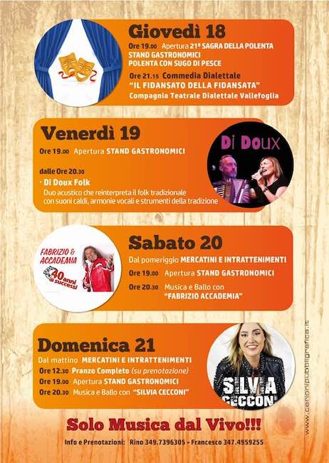 Protagonista dell’evento è la polenta preparata con cura e con passione negli stand gastronomici aperti dalle ore 19.00.