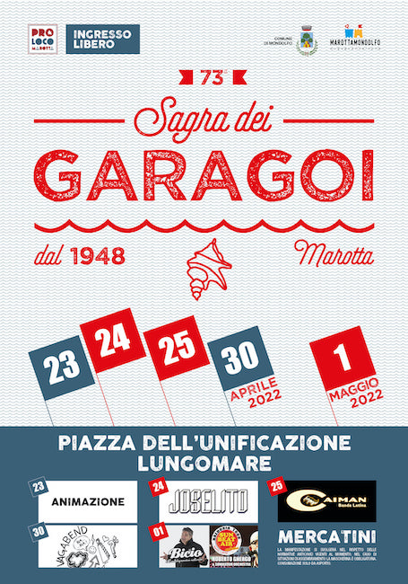 MAROTTA (PU) – Dopo lo stop forzato per la pandemia torna l’attesissima Sagra dei Garagoi. L’evento più longevo e rappresentativo di Marotta, che quest’anno giunge alla 73esima edizione, è in programma il 23, 24, 25, 30 aprile e 1 maggio. Cinque giornate all’insegna del gusto, delle tradizioni e del divertimento, durante le quali non mancherà attenzione al sociale. Ad organizzare la Sagra la Pro loco di Marotta con il patrocinio e la collaborazione dell’Amministrazione comunale.