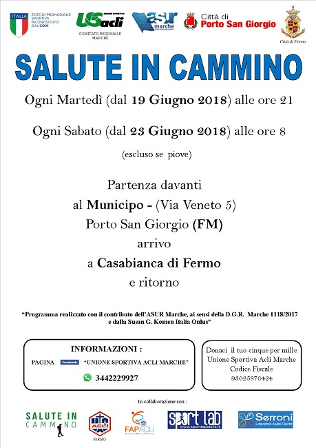PORTO SAN GIORGIO – Prenderà il via martedì 19 giugno il progetto regionale “Sport senza età” di cui è titolare il comitato regionale Marche dell’Unione Sportiva Acli. L’iniziativa è cofinanziata dall’Asur Marche (Deliberazione di Giunta Regionale 1118/2017) e dalla Susan G. Komen Italia Onlus, organizzazione internazionale che si occupa di prevenzione del tumore al seno ed alla sua realizzazione stanno collaborando le amministrazioni comunali di Fermo e Porto San Giorgio, Acli e Fap Acli di Fermo, Sport Lab e Laboratorio analisi cliniche Serroni.