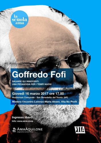 SAN BENEDETTO DEL TRONTO – Giovedì 16 marzo alle ore 17, presso l’Auditorium Comunale di San Benedetto del Tronto, si terrà “Salvare gli innocenti. Una pedagogia per i tempi nuovi”, incontro con Goffredo Fofi. Si tratta di una riflessione incentrata sull’importanza dell’educazione come strumento di consapevolezza civile e di rivoluzione. L’evento apre l’offerta didattica 2017 de “La scuola Ama”, l’Agenzia accreditata di alta formazione della Cooperativa Ama Aquilone. L’ingresso è libero.