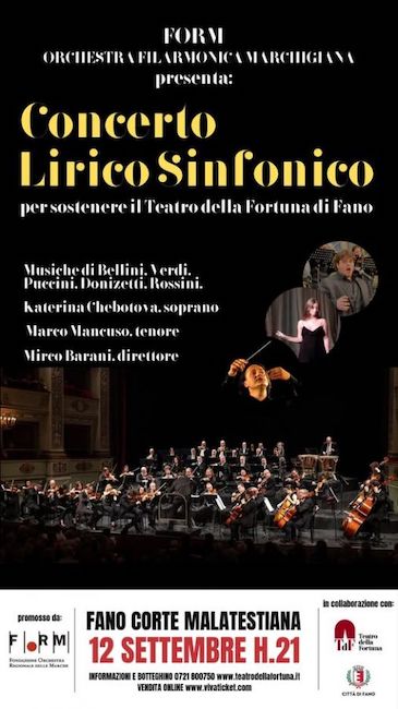 Il 12 settembre, alla Corte Malatestiana, a sostegno della campagna “Salviamo il Teatro della Fortuna di Fano”, serata speciale della Form con il tenore Marco Mancuso, il soprano Katerina Chebotova e la direzione del maestro Mirco Barani