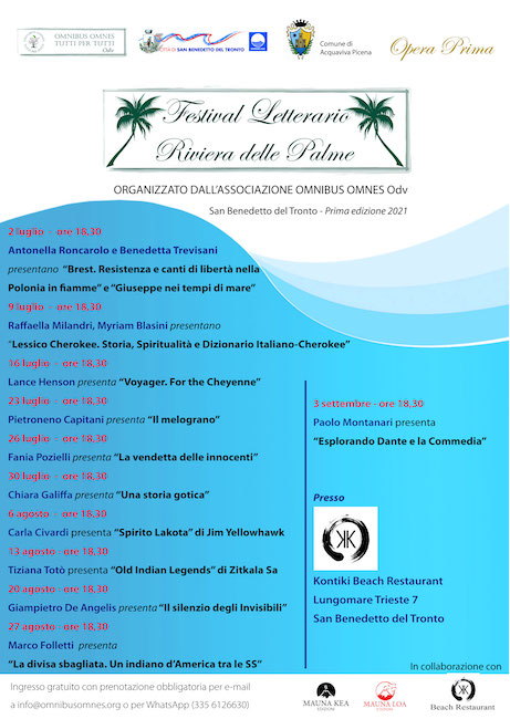 SAN BENEDETTO DEL TRONTO – Grande curiosità e aspettativa per il nuovo Festival Letterario che verrà ospitato a San Benedetto del Tronto: partirà il 2 luglio la prima edizione del Festival Letterario Riviera delle Palme, organizzato dalla associazione Omnibus Omnes. Il calendario, che ha una scaletta di appuntamenti settimanali fino a ottobre, avrà tra gli ospiti sia validissimi e noti autori sambenedettesi, come per esempio Antonella Roncarolo e Benedetta Trevisani, sia autori di calibro internazionale come Lance Henson, poeta Cheyenne tra i maggiori autori Nativi Americani.