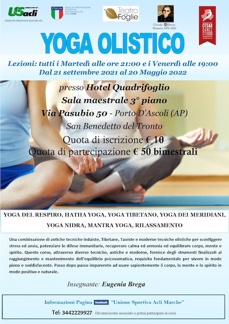 SAN BENEDETTO DEL TRONTO – Riprenderà lunedì 21 settembre il corso di yoga olistico presso l’Hotel Quadrifoglio (sala maestrale, terzo piano) in via Pasubio 50 a Porto d’Ascoli.