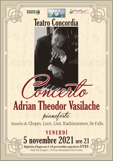 SAN BENEDETTO DEL TRONTO – L’UTES – Università di tutte le età e del tempo libero di San Benedetto del Tronto, nell’ambito delle sue numerose attività culturali, venerdì 5 novembre 2021, alle ore 21.00, presso il Teatro Concordia, organizza uno concerto che vedrà Adrian Theodor Vasilache eseguire al pianoforte musiche di Chopin, Lozzi, Liszt, Rachmaninov e De Falla.