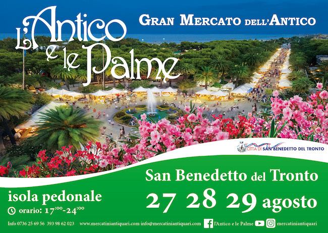 SAN BENEDETTO DEL TRONTO – Si torna a respirare aria di antiquariato a San Benedetto del Tronto con L’Antico e le Palme: l‘ultima edizione della stagione da venerdì 27 a domenica 29 agosto nell’isola pedonale di San Benedetto del Tronto, nel cuore della riviera adriatica. Appuntamento fisso dal 1994, la manifestazione sambenedettese di antiquariato e collezionismo è una delle rassegne più conosciute tra i mercatini dell’antiquariato del centro Italia e non solo, divenuto negli anni un punto di riferimento per migliaia di appassionati di oggetti che fanno parte del nostro passato e delle nostre tradizioni.