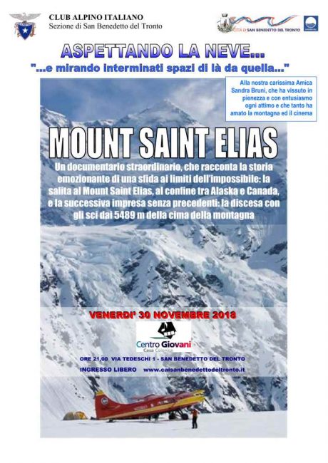 Venerdì 30 novembre –>proiezione del film “MOUNT SAINT ELIAS” di Gerald Salmina.