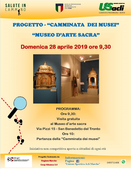 SAN BENEDETTO DEL TRONTO – Farà tappa al “Museo di arte sacra”, in via Pizzi 15, la quarta tappa della quinta edizione del progetto “Camminata dei musei” promosso dall’Unione Sportiva Acli. Si tratta di una iniziativa che sta coinvolgendo sempre più persone e che è finalizzata a promuovere strutture museali che sono fuori da grandi circuiti culturali, ma che hanno delle ricchezze sicuramente da valorizzare.