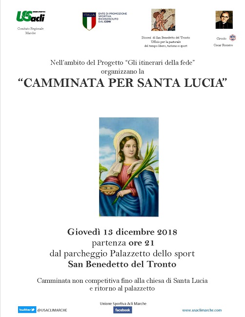 SAN BENEDETTO DEL TRONTO – Nell’ambito del progetto “Gli itinerari della fede” ed alla vigilia delle festività natalizie, è in programma per giovedì 13 Dicembre alle ore 21 la ”Camminata per Santa Lucia”, ricorrenza particolarmente cara in città. L’iniziativa è di Circolo Acli Oscar Romero, U.S. Acli Marche, e Ufficio per la pastorale turismo, sport e tempo libero della Diocesi di San Benedetto del Tronto e nelle precedenti edizioni ha riscosso sempre un buon successo di partecipanti.