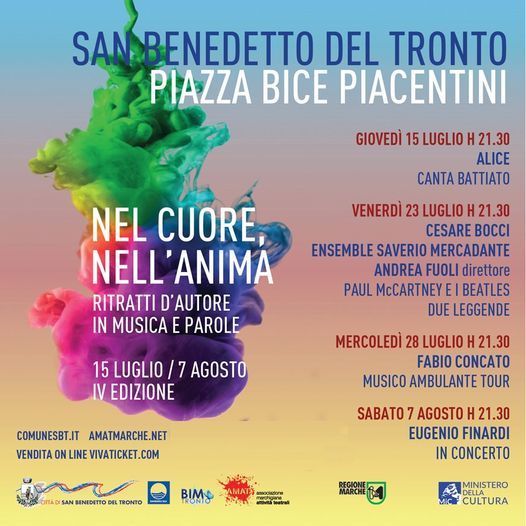 SAN BENEDETTO DEL TRONTO – Ha preso il via a San Benedetto del Tronto il 15 luglio e terminerà il 7 agosto 2021 la quarta edizione di “Nel cuore, nell’anima. Ritratti d’autore in musica e parole”, la rassegna, in cui grandi interpreti della canzone italiana omaggiano i grandi autori. In Piazza Piacentini quattro appuntamenti promossi da Comune e AMAT con il contributo di Regione Marche e Ministero della Cultura e il sostegno di BiM Tronto.