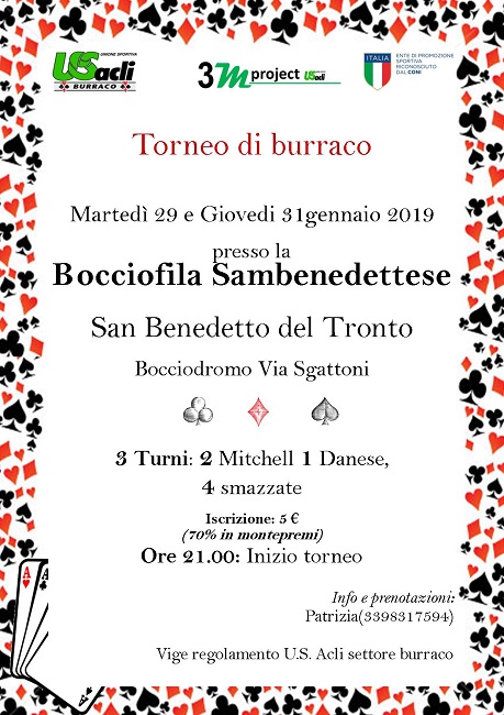 SAN BENEDETTO DEL TRONTO – Martedì 29 e giovedì 31 gennaio si gioca a burraco presso la sede della Bocciofila Sambenedettese in via Sgattoni.