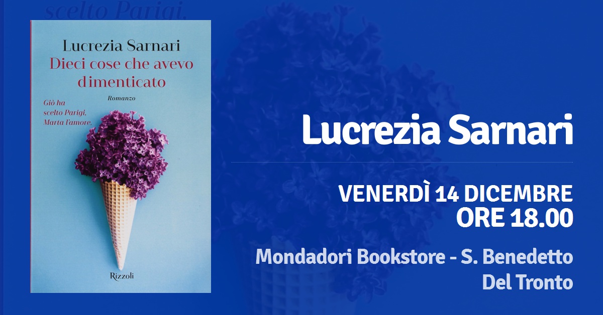 SAN BENEDETTO DEL TRONTO- Venerdì 14 dicembre 2018,alle ore 18.00, presso il Mondadori Bookstore a San Benedetto del Tronto,si terrà la presentazione del libro “Dieci cose che avevo dimenticato” di Lucrezia Sarnari.
